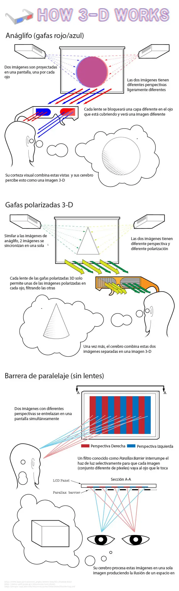 El siguiente gráfico de Online Schools muestra como funciona el 3D, mostrando básicamente 3 de los métodos utilizados en la estereoscopía: Anaglífos, utilizando unas gafas que son fácil de construir; Lentes Polarizados, como las utilizados en NVIDIA 3D Vision o en el cine con RealD; y Parallax Barrier, un método empleado por algunos fabricantes televisiones 3d como la tecnología WOWvx 3D de Philips.
