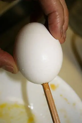 Lo primero que hay que hacer es vaciar el huevo. Debes hacer un orificio muy pequeño con la aguja en la parte superior del huevo y luego otro de mayor tamaño, en la parte inferior. Y soplando desde el pequeño agujero harás salir todo el contenido.