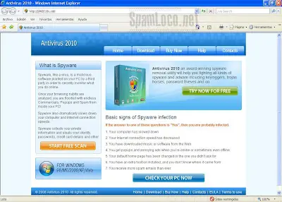Antivirus 2010 es un nueva variante de los falsos programas de seguridad conocidos como Antivirus 2008 y Antivirus 2009. A continuación una captura del sitio fraudulento y del programa instalado en Windows: