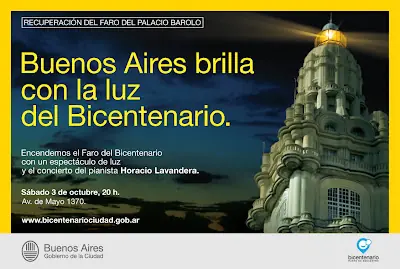 El emblemático faro de la CIUDAD de BUENOS AIRES ubicado en la cima de la torre del Palacio Barolo, reparado y puesto en valor, brillo el sábado 3 de octubre de 2009 por primera vez para los festejos que organiza el programa Puertas del Bicentenario, que lleva adelante el Gobierno de la Ciudad de Buenos Aires.