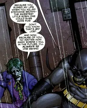Analizemos detenidamente: un pobre hombre, desesperado por mantener a su esposa embarazada, comete un acto desesperado. Nada de muertes o de violencia, sino quitar silenciosamente algo de dinero para poder mantenerla. A ultimo momento intenta redimirse, pero en su escape el “caballero oscuro” aparece siniestremante y le aplica un brutal castigo, deformandolo para siempre y arrastrandolo hacia la locura. Un hombre con capucha lo arrojo a un tanque de sustancias quimicas que quemaron su piel dolorosamente. Quizas el payaso solo quiere evitar que este murcielago siga vengandose brutalmente de todos los que se le cruzan…
