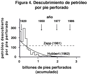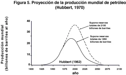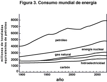 Revisemos ahora la situación energética mundial. El consumo mundial de energía se ilustra en la figura 3 . Notamos que en la actualidad el 39% del consumo corresponde a petróleo, el 22% a gas natural, el 26% a carbón, el 6% a hidroelectricidad y el 7% a energía obtenida de la fisión nuclear. A la taza actual de consumo, las reservas probadas de petróleo, gas y carbón se agotarían en 50, 65 y 225 años respectivamente. Es posible incrementar las reservas descubriendo nuevos yacimientos de petróleo, gas y carbón, y obteniendo petróleo adicional de pozos existentes mediante tecnologías costosas de extracción secundaria. La creciente dificultad de encontrar petróleo se ilustra en la figura 4. Por lo tanto estimamos que las nuevas reservas de hidrocarburos quedan compensadas por el incremento del consumo, de manera que el petróleo y el gas dejarán de ser una fuente significativa de energía hacia el año 2050. Esto se ilustra en la figura 5. A partir de entonces la fuente principal de energía de la humanidad será el carbón, que a ese nivel de consumo se agotará hacia el año 2100 .