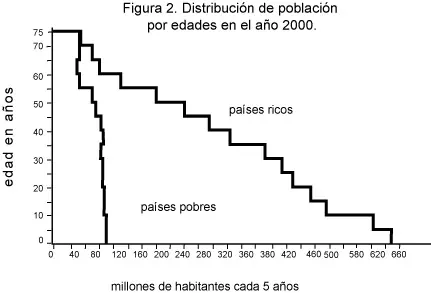 Para entender la dinámica de poblaciones debemos dividir a la humanidad en países ricos, con una población madura y estable, y países pobres, con una población joven y creciente. La distribución de población por edades se indica en la figura 2. Notamos la elevada proporción de niños en los países pobres. El crecimiento anual de una población está determinado por la fertilidad (número promedio de hijos por mujer) y por el número de mujeres en edad fértil. Actualmente (en 1999 ) la fertilidad es de 1.8 en países ricos y 2.8 en países pobres. En países ricos la población actual de 1.300 millones permanecerá aproximadamente constante hasta el año 2050 . En cambio, en países pobres la población actual de 4.700 millones crecerá inevitablemente debido al elevado número de jóvenes. Si la fertilidad actual se mantiene, la población en países pobres en el año 2050 alcanzaría los 12 mil millones. Si, en cambio, logramos reducir HOY la fertilidad a dos hijos por pareja, la población en países pobres en el año 2050 será de 7.700 millones . La figura 1 muestra el caso "realista" en que la fertilidad en los países pobres se reduce gradualmente a 1.8 hasta el año 2020 . En conclusión es imperativo lograr una fertilidad menor que dos cuanto antes. En el año 2050 el 86 por ciento de las personas vivirán en países pobres.