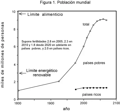 Consideremos primero la población mundial. Fue de mil millones en el año 1800, dos mil millones en 1925, cuatro mil millones en 1974 y seis mil millones en 1999. Estimamos que la población mundial llegará a ocho mil millones en el año 2023 y a nueve o diez mil millones en el año 2050. Este es justamente el límite que el planeta tierra aún puede alimentar "bien" con agricultura intensiva de alta tecnología y rendimiento. Sin embargo este nivel de población no es sostenible una vez que se agoten las reservas de petróleo y gas natural hacia el año 2050 y de carbón hacia el año 2100. Entonces la población mundial deberá necesariamente decrecer hacia fines del siglo XXI como se indica en la figura 1. El límite natural sostenible del planeta tierra una vez que se agoten el petróleo, gas y carbón (y suponiendo que la humanidad tiene la sabiduría de no utilizar reactores nucleares) es de aproximadamente tres mil millones de personas (al nivel actual de consumo de energía por habitante). Esta es la población que pueden sostener las fuentes renovables de energía. ¡Y ya hemos sobrepasado este límite energético a causa del consumo transitorio de hidrocarburos no renovables! A continuación justificaremos lo dicho.