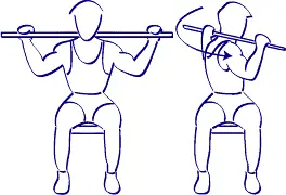 De pie, los pies apartados del ancho del barreño para encontrar un apoyo y un equilibrio correcto, una barra derecha en las manos que han apartado del ancho de los hombros alrededor de, la barra es en apoyo sobre la parte delantera de vuestros hombros y las palmas de las manos han orientado hacia ella antes.