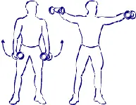 De pie, un peso en cada mano, las manos han apartado del ancho de los hombros. Levantáis los brazos hasta que formen un ángulo recto con el busto, los brazos deben ser paralelos al suelo.
