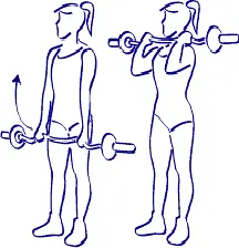 En posición de salida, los brazos son paralelos al suelo, las palmas de las manos orientadas hacia el antes. Levantad simultáneamente los dos pesos.
