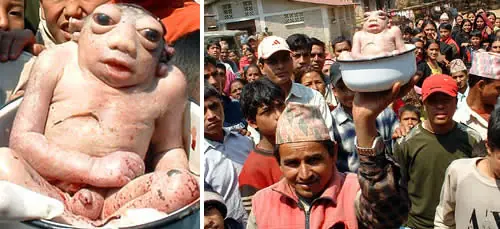 Este bebe bizarro Nacio en el 2006 en Charikot y fue llamado Rene . Llamo la atencion de toda una multitud por su ausencia de cuello , ojos saltones (muy saltones ) y demas malformaciones.
