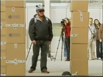 Un par de anteojos que emiten un láser que permite localizar objetos por sonidos a una distancia de 5 metros, el otro, con un alcance de 15 metros se basa en un sistema de estereovisión con dos cámaras ubicadas en un casco.