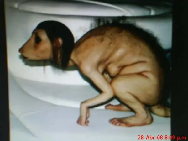 Ha sido descrito como un oso grande nocturno, cubierto de pelo rojo que camina erecto como un hombre, con cara de faciones humanas y que emite un terrible olor. Las patas, con garras, las tiene viradas hacia atrás. Siempre se le ha visto seguido de una nube de moscas.Tiene un peso aproximado de unas 600 libras y una altura de más de 6 pies.