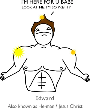 Edward escucha intensamente todo lo que pantalones tiene que decir, aun si ella se pone a describir la diarrea que tuvo en navidad o su forma preferida para cortar un sandwich a la mitad, hasta donde el lector se entera, a Edward no le interesa nada más que pantalones en el mundo. Lo que hizo el autor fue crear la perfecta figura masculina, una pálida estatua griega la cual el autor puede adular y en recompensa ser adulada por la misma.
