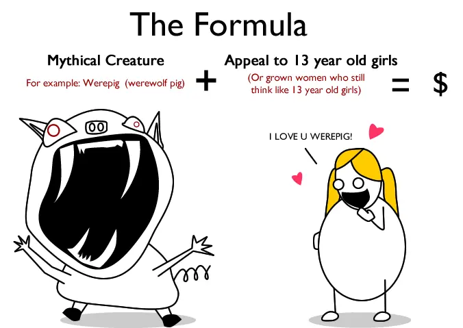 La formula Criatura mítica, por ejemplo: el lobicerdo (lobizón+cerdo) + Chicas de 13 años (o mujeres grandes que todavía piensan que tienen 13) = $$$$. "Te amo lobicerdo"