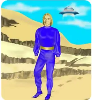 Muy sorprendido quedó al verse frente a un hombre alto, de ojos grandes y largos, cabellos rubios, que le hablaba telepáticamente. Vestía un sorprendente traje hecho todo de una pieza, muy poco apropiado para el desierto, con pantalones abombados, ancho cinturón, sin ojales, cierres ni botones. Cerca de él se mantenía suspendida una pequeña nave espacial del tipo de las exploradoras, que había salido de la enorme nave anteriormente vista.