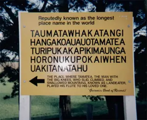 El nombre es considerado uno de los más largos utilizables en la lengua inglesa, y ha hecho acto de presencia en varias canciones. Su traducción es algo como: "La cima en donde Tamatea, el hombre con grandes rodillas, escalador de montañas, el tragador de tierra que ha viajado, tocó su flauta de nariz para su amada". Y gracias al Cielo por el copiar y pegar, ni borracho escribo todo eso...