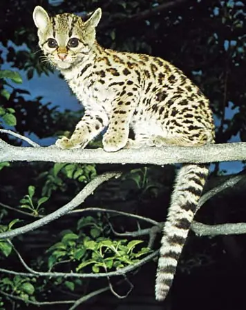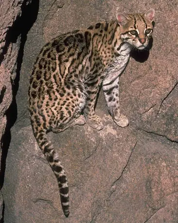 Características: Gato silvestre con la cola larga, que ocupa de 35 a 45% del largo total del animal, que vara de los 90 cm. a 1,20 m. Las orejas son redondeadas negras por afuera con un lunar blanco.