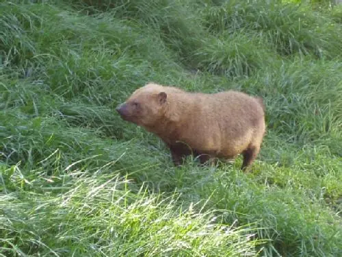 Características: Es un animal de la familia del perro, alargado y bajito, de aproximadamente un metro de largo y 30 centímetros de alzada. Su hocico es chato y ancho, y su color pardo oscuro, ms rojizo en la cabeza. Acostumbra a vivir en grupos de 10 o ms individuos, a menudo familiares, y a cazar también en conjunto, alimentándose principalmente de pequeños roedores y aves terrestres.