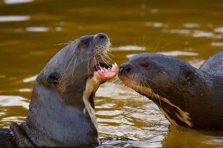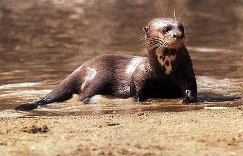 Características: Nutria de color pardo lustroso o brillante en las partes superiores y ms claro llegando al gris ceniza en las inferiores, con la zona gular de color amarillento.