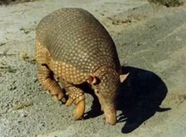 Características: Mide unos 150 a 160 cm. de longitud total, de los cuales 50 cm. corresponden a la cola y está recubierto de un gran caparazón formado por numerosas placas de coloración amarillenta en los flancos y mas parda en lo dorsal. Su peso estimado es de unos 60 kg. aunque pueden existir individuos con un peso superior.