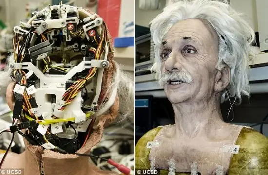 En concreto la cabeza del robot tiene 30 “músculos”, algo menos que el rostro del ser humano, cada uno de los cuales se mueve con un pequeño motor independiente. La “piel” está hecha de un polímero elástico llamado Frubber, desarrollado por la empresa Hanson Robotics, que le aporta grandes dosis de realismo. Para “enseñarle” a Einstein-robot a expresar emociones con la cara, los investigadores, liderados por Javier Movellan, le colocaron un espejo delante con el fin de que analizase sus propias expresiones. Esto proporcionaba a la máquina los datos necesarios para “aprender” la relación entre los gestos y los movimientos de sus motores. Una vez establecidas estas relaciones, el robot consiguió desarrollar nuevos gestos para los que no había sido programado originalmente.