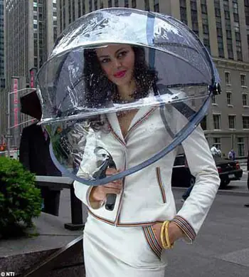 Es un auténtico paraguas manos-libres que permite cubrir a alguien con una especie de semiesfera plegable.