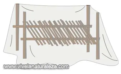 Este refugio nos aísla del suelo y nos protege de insectos. Si se le añade un techo nos protegerá además de la lluvia. El lecho lo cubriremos con hojas de palmera u otra materia vegetal.