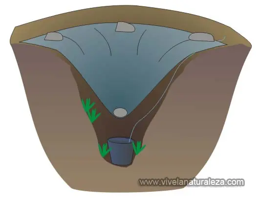 La temperatura suele ser varios grados más baja a unos centímetros por debajo del suelo, por lo que excavaremos un hoyo que cubriremos con una tela o el material del que dispongamos y que nos ofrezca sombra.