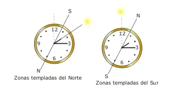En las zonas templadas del hemisferio norte, si alineamos la aguja horaria (la pequeña) con el sol, en la bisectriz que forma esta con la cifra "12" del reloj se encuentra siempre el sur.
