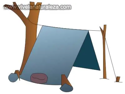 Si disponemos de una lámina de plástico suficientemente grande podemos improvisar un refugio tendiendo una cuerda entre dos árboles y colocando la lámina como una tienda de campaña clásica. En los extremos envolveremos unas piedras que luego sujetaremos con unas orquillas de madera o las anudaremos y las afirmaremos con cuerdas y piquetas improvisadas con unos palos de madera resistente. Si cavamos una zanja alrededor evitaremos que nos anegue el agua en caso de tormenta.