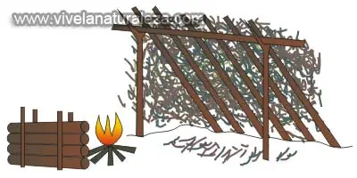 En las zonas donde no hay mucha nieve y tenemos madera abundante, podemos construir un cobertizo clásico con el lado inclinado apuntando en la dirección del viento. Haremos un fuego y colocaremos un reflector de troncos o piedras que refleje el calor hacia nosotros.