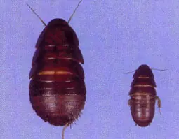 Es muy similar a la cucaracha americana pero un poco mas chica, mide alrededor de 25 mm y son de color caoba, tanto el macho como la hembra tienen alas mas largas que el cuerpo, a las ninfas se las reconoce por el largo de las antenas.