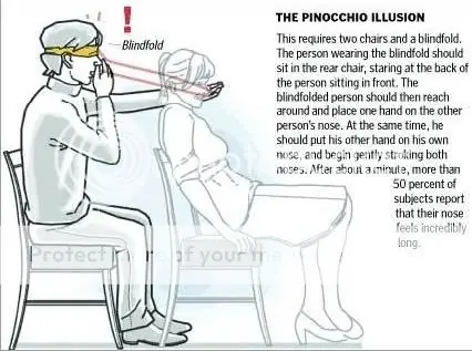 La ilusión de Pinocho: requiere dos sillas colcadas una detrás de la otra y una venda. La persona que se sienta en la silla trasera se colocará la venda y tocará la nariz de otra persona sentada en la silla delantera. Al mismo tiempo colocará su otra mano en su propia nariz y comenzará a acariciar suavemente ambas narices. Tras aproximadamente un minuto más del 50% de los individuos sienten que su nariz es extremadamente larga.
