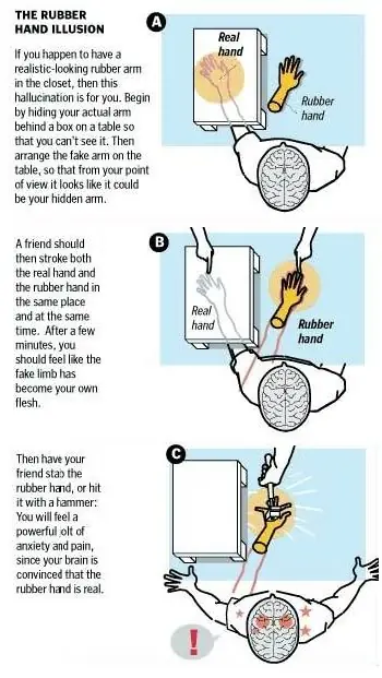 La ilusión de la mano de goma: el primer paso sonsiste en ocultar nuestra propia mano en el interior de una caja o debajo de la mesa de manera que no podamos verla. Tras esto debemos situar sobre la mesa una mano falsa de tal forma que, desde nuestro punto de vista, parezca que es nuestra mano. Un compañero tocará a la vez nuestra mano y la falsa en el mismo punto. Tras unos minutos sentiremos que la mano falsa se ha convertido en nuestra mano real. Si nuestro compañero golpeara la mano falsa o la punzara sentiríamos un intenso dolor al estar nuestro cerebro convencido de que se trata de una extensión real de nuestro cuerpo.