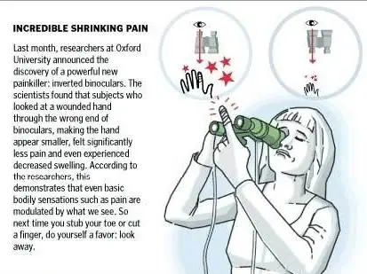El increible dolor menguante: El pasado mes, investigadores de la Universidad de Oxford, anunciaron el descubrimiento de un nuevo y poderoso analgésico: unos binoculares invertidos. Estos instigadores comprobaron que cuando una persona miraba su mano herida por el extremo contrario de los binoculares y verla más pequeña hacía que el dolor disminuyera de igual manera. Esto demuestra que sensaciones como el dolor son moduladas por lo que vemos.