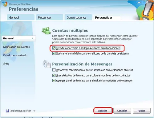 En la ventana que aparece, dirígete a Personalizar y luego marca la casilla Permitir conectarme a múltiples cuentas simultáneamente, luego dale clic al botón Aceptar y listo!