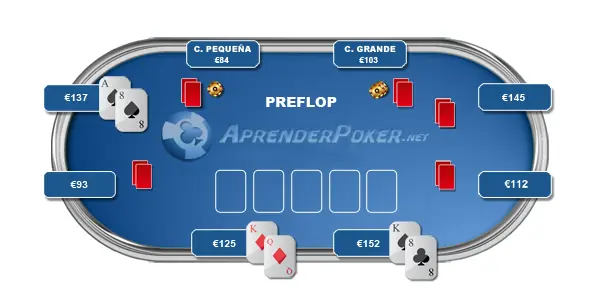 Dicho sea de paso, este último hará la apuesta ciega pequeña, y el que se sienta a su izquierda, la apuesta ciega grande. Estas apuestas se realizan para obligar a los jugadores a poner dinero en el bote, que servirá como motivación para que los jugadores participen en la mano. Sin embargo, solamente estos dos jugadores podrán hacer las apuestas ciegas.
