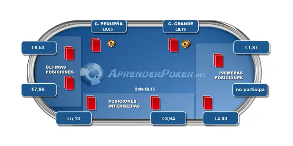 La persona sentada justo a la izquierda del dealer es quien debe colocar la apuesta ciega pequeña antes de la repartición de los naipes. En el sentido de las agujas del reloj, el puesto siguiente de la mesa corresponde a quien hace la primera apuesta ciega grande. Las dos posiciones justo a la izquierda de las posiciones ciegas son las posiciones tempranas (early position) y luego están las posiciones intermedias (middle position).