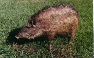 Características: Es el mayor de los chanchos silvestres. Su longitd total varía entre 1 m. y 1.22 m., correpondiendo a la cola unos 7 a 11 cm. En cuanto al peso ronda los 30 a 40 kg. La coloración es pardo grisácea. Sus orejas llegan a los 11 o 12 cm. de largo.