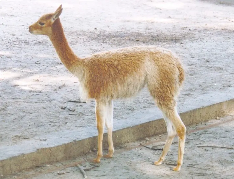 Características: Es de aspecto gracil y llega a los dos metros (7 pies) de longitud desde la cabeza a la punta de la cola, y a casi un metro (3 pies) de altura. Su dieta es exclusivamente hervivora y tiene una sola cria por año, que nace despues de once meses de gestacion. Su lana esta considerada la mas fina del mundo.