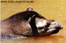Características: El tapir alcanza el metro de altura y sus ejemplares más grandes pesan hasta 220 kg. Este es un mamífero hervíboro (gran dispersor de semillas a través de sus deyecciones, siendo por ende, un "restaurador de bosques", pues también suele transitar por zonas raleadas), de curiosa apariencia (posee una trompa prensil que le permite tomar hojas de los árboles y conductas tranquilas. Prefiere las cercanías a los cursos de agua.