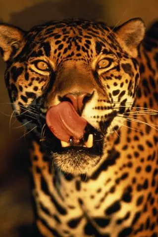 Características: De aspecto pesado y robusto, es el felino más grande de América llegando hasta los 2,5 m. de largo y 140 kgs. de peso. Su pelaje bayo anaranjado muestra mayor palidez en los costados y se halla salpicado de rosetas negras, que llegan a medir 9 cm. de diametro, por todo el cuerpo.