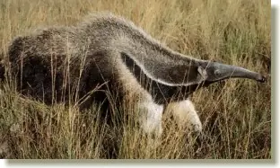 Características: Se distingue por su pelaje duro, largo y cerdoso, que forma en el cuello una crin de hasta 24 cm. de longitud y se prolonga en una extensa cola, poblada de pelos de hasta 40 cm. de extensión, los cuales le otorgan el aspecto de un abanico o "bandera". La cabeza presenta un hocico largo y tubular con la pequeña boca en el extremo, los ojos y las orejas son pequeños. Su coloración varía desde el negro al blanco, pasando por diversas tonalidades de gris. Alcanza los 215 cm. de largo y llega a los 50 Kg. Su lengua puede extenderla unos 61 cm. fuera de la boca