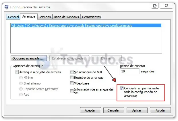 Para que estos cambios sean permanente tenemos que marcar la casilla de Convertir en permanente toda la configuración de arranque.