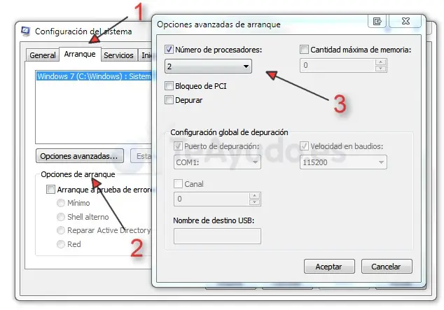 Pestaña de Arranque (1) >> botón Opciones Avanzadas (2), activamos la casilla de Número de procesadores (3) y en el desplegable seleccionamos el número de procesadores que tiene el equipo. Si solo aparece 1 no podemos activar este truco.