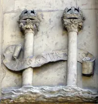 La representación del signo corresponde al símbolo de armas español que representa las columnas de Hércules y un listón alrededor de ellos con forma de “S” que lleva el lema "Plus Ultra" que significa algo así como “y mas allá” y que reemplazo al de “Non Plus Ultra “original que significaba “y nada mas” porque antes del descubrimiento de América las columnas de Hércules representaban el limite del mundo “plano”.