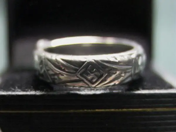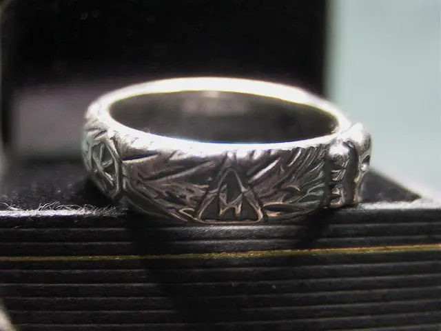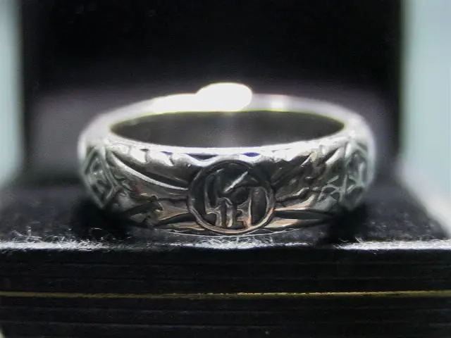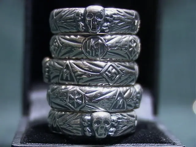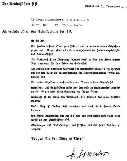 I award you the SS Death's Head Ring. The ring symbolizes our loyalty to the Fuhrer, our steadfast obedience and our brotherhood and comradeship. The Death's Head reminds us that we should be ready at any time to lay down our lives for the good of the Germanic people. The runes diametrically opposite the Death's Head are symbols from our past of the prosperity which we will restore through National Socialism. The two Sig-Runes stand for the name of our SS. The swastika and the Hagall-Rune represent our unshakable faith in the ultimate victory of our philosophy. The ring is wreathed in oak, the traditional German leaf. The Death's Head Ring cannot be bought or sold and must never fall into the hands of those not entitled to wear it. When you leave the SS, or when you die, the ring must be returned to the Reichsfuhrer-SS. The unauthorized acquisition of duplicates of the ring is forbidden and punishable by Law. Wear the ring with honor!