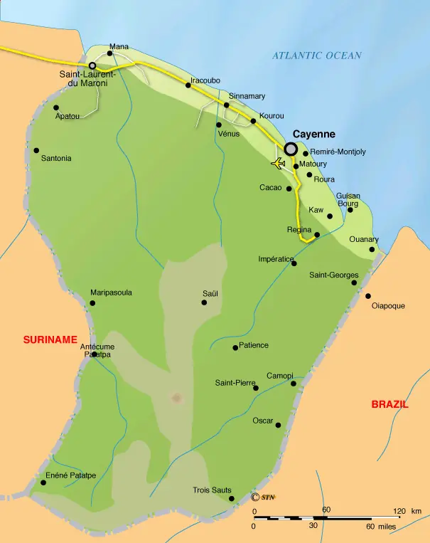 La Guayana Francesa ocupa 90.000 km2 en la costa nordeste de América del Sur; limita con Surinam al oeste y con Brasil al este y al sur. Una densa selva ecuatorial cubre 90% de su territorio. Los principales medios de acceso al interior son las vías fluviales y tan solo por lancha motora se puede llegar a la mayor parte de las comunidades.