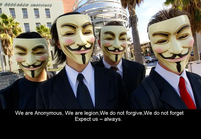Las acciones atribuidas a Anonymous son llevadas a cabo por individuos no identificados que se autodenominan Anonymous. Después de una serie de polémicas, protestas y ataques DDoS en 2008, los incidentes vinculados a sus miembros son cada vez más comunes.