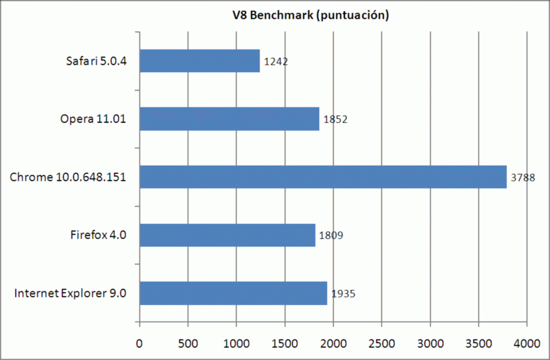 Si para cada prueba consideramos que el mejor navegador obtiene 10 puntos y, al resto, los evaluamos de manera inversamente proporcional, obtendríamos la siguiente clasificación: