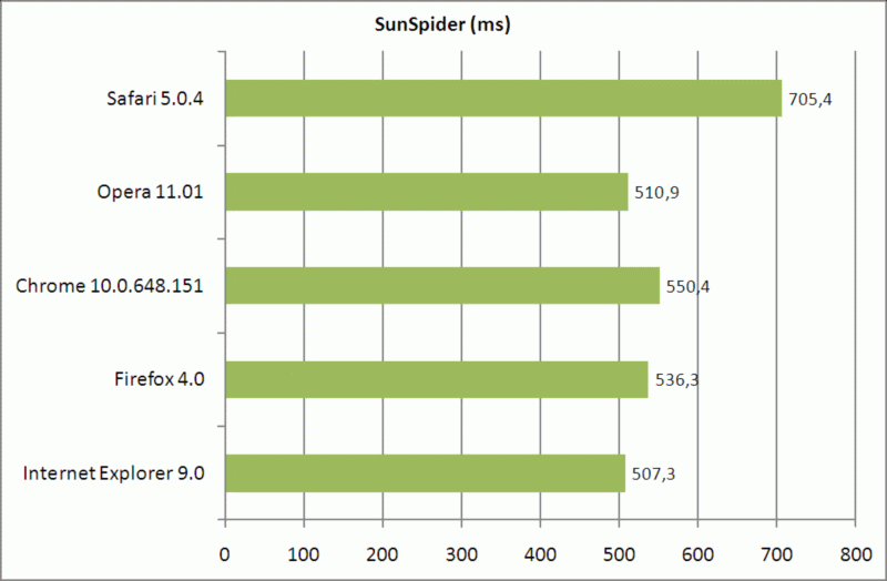 En esta ocasión el benchmark realizado con SunSpider nos ofrece unos resultados que están muy cercanos entre sí y, prácticamente, con muy poca diferencia, salvo el caso de Safari que acaba resultando ser el peor de los cinco navegadores, clasificación que es coronada por Internet Explorer 9 como el navegador que mejor nota obtiene en esta prueba.