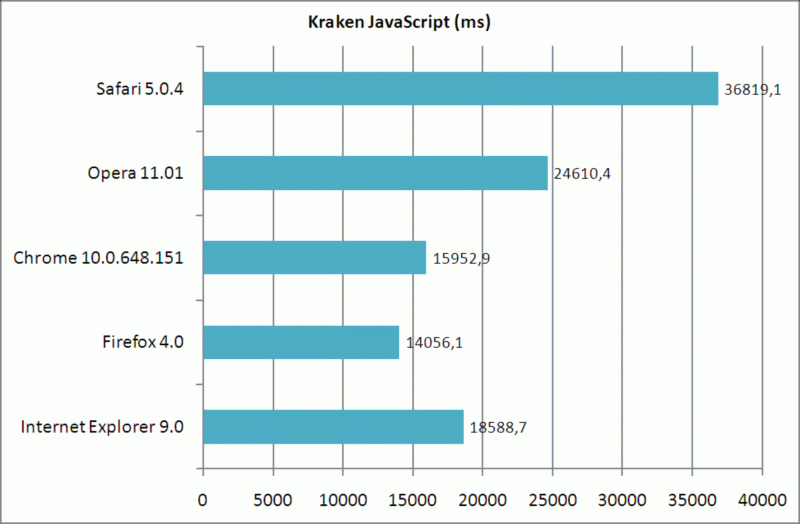 Kraken es un benchmark auspiciado por la Fundación Mozilla, por lo que no resulta nada extraño que el recién llegado Firefox 4 se corone como el navegador más rápido tras pasarlos todos por esta prueba.